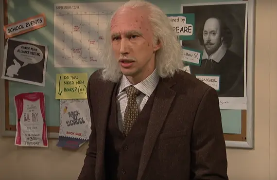 You may remember Abraham from Driver's last appearance on the show, the Season 44 premiere, where, in a sketch written by Eli Coyote-Mandel, Driver played an old man called to speak in front of his son's high-school class. The son was played by Pete Davidson, and if you're wondering whether Pete spent the whole sketch mumbling his lines and breaking character at the slightest provocation, wonder no more, because he definitely was. No matter, though, because the second Driver walks through the door, bald-capped and liver-spotted, armed with a cane and the righteous fury of an impotent old oil baron who can no longer do anything more than terrorize his soft disappointment of a son.